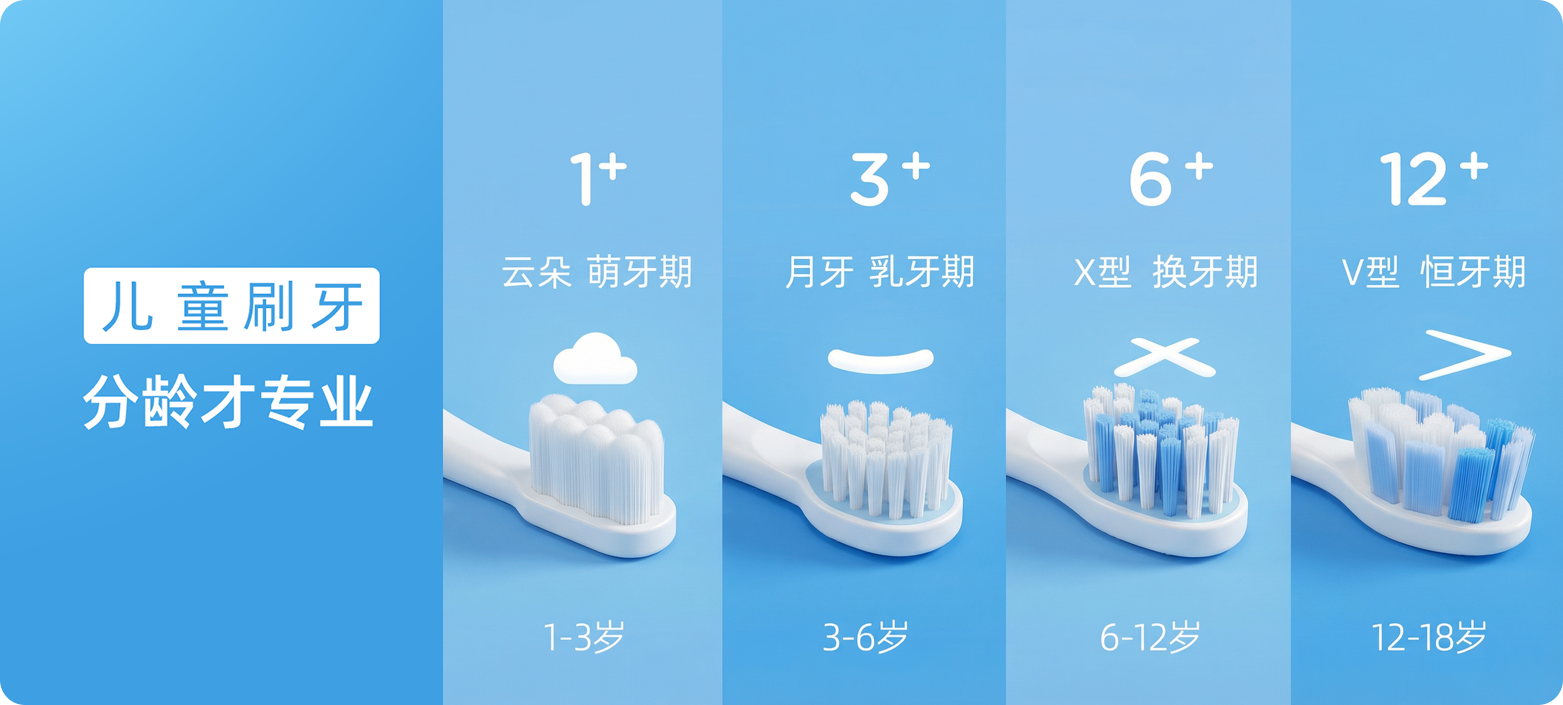 1-3岁萌牙期(云朵特柔刷)· 3-6岁乳牙期(月牙呵护刷)· 6-12岁换牙期(X型特护刷)