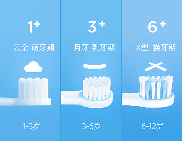 1-3岁萌牙期(云朵特柔刷)· 3-6岁乳牙期(月牙呵护刷)· 6-12岁换牙期(X型特护刷)